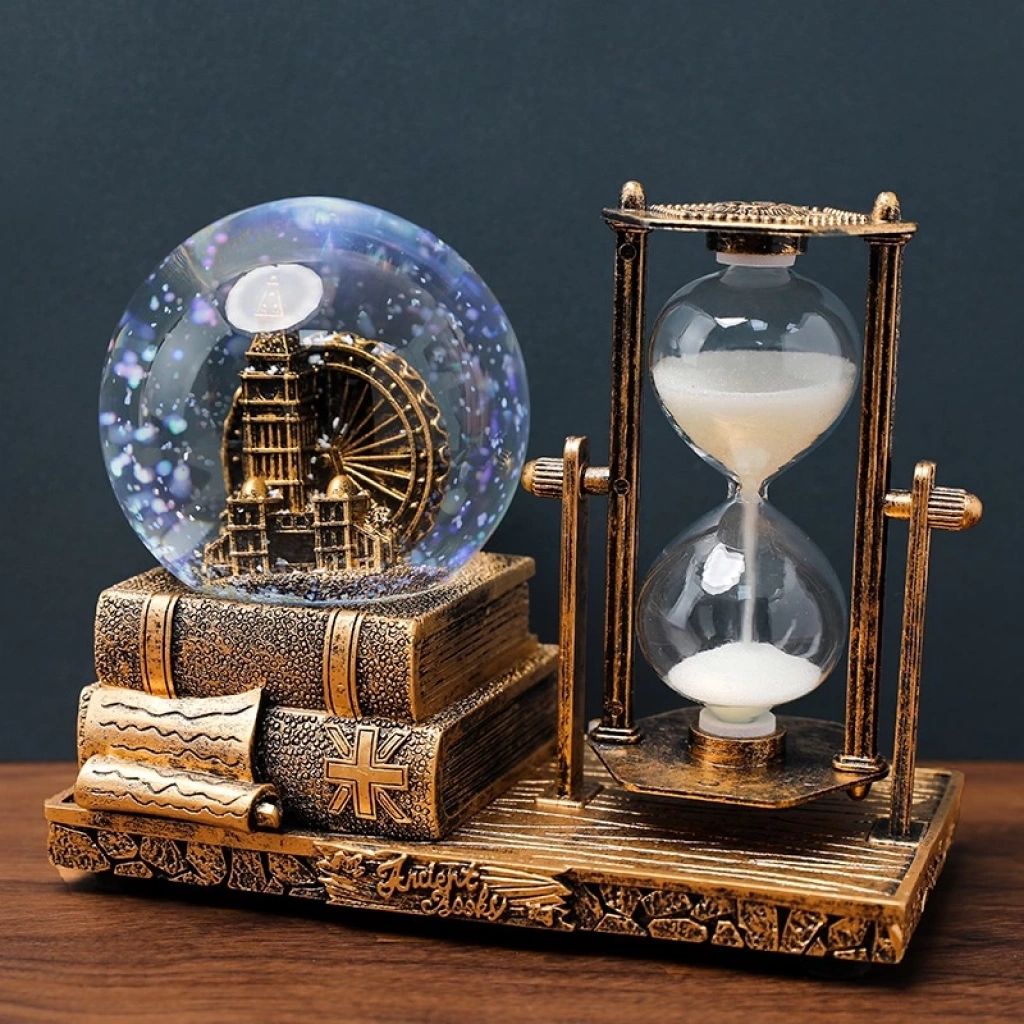 DEKORATİF KAR KÜRESİ VE KUM SAATİ GOLD RENKÜrün ÖzellikleriZarif detayları ve şık tasarımıyla Dekoratif Kar Küresi ve Kum Saati Gold Renk, hem klasik hem de modern dekorasyonlara uyum sağlar. Altın tonlarındaki metalik kaplama, estetik bir parlaklık kazandırırken üzerindeki Big Ben ve London Eye figürleri, nostaljik bir hava oluşturur. Kar küresinin içindeki ışıltılı simler, sallandığında büyüleyici bir görüntü ortaya çıkarır.Yan kısmındaki kum saati ise hem dekoratif bir öğe hem de zamana anlam katan bir detay olarak dikkat çeker. Kitap formundaki alt kaidesi, ürüne sanatsal bir dokunuş kazandırır. Masa, raf veya çalışma alanlarında sergilenmek için mükemmel bir seçimdir. Sevdiklerinize hediye edebileceğiniz özel ve anlamlı bir dekoratif üründür.Paket İçeriği1 adet Gold Renk Dekoratif Kar Küresi ve Kum Saati