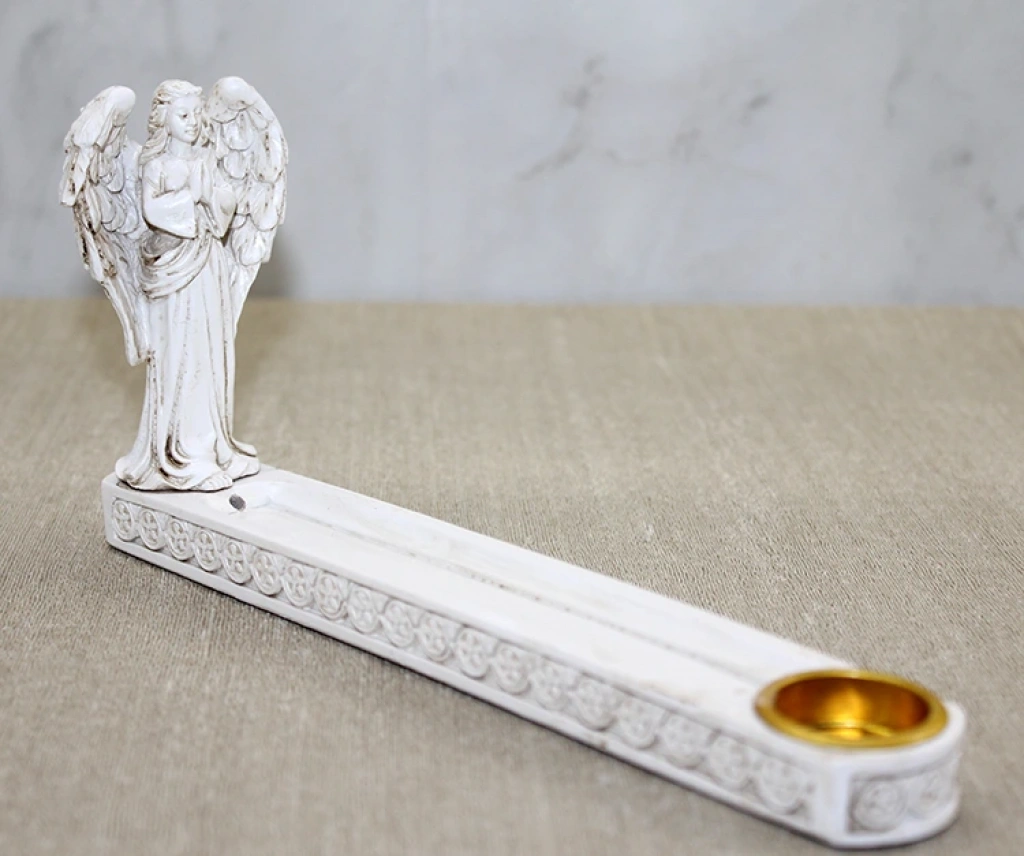 POLYESTER MELEKLİ TÜTSÜLÜKÜrün ÖzellikleriPolyester Melekli Tütsülük, zarif melek figürü ile tasarlanmış şık ve dekoratif bir tütsülük modelidir. 24 cm boyutundaki uzun formu sayesinde tütsü çubuklarını güvenli biçimde taşırken aynı zamanda kullanıldığı ortama estetik bir görünüm kazandırır. Melek figürünün detaylı işçiliği ürüne zarafet katar ve bulunduğu alanda huzurlu bir atmosfer oluşturur. Polyester malzeme yapısı sayesinde dayanıklı, hafif ve uzun ömürlüdür. Hem günlük tütsü kullanımında hem de dekoratif amaçla vitrinlerde, masa üstlerinde ve meditasyon köşelerinde tercih edilebilecek özel bir tasarımdır. Manevi temalı objeleri sevenler veya şık bir hediye arayanlar için ideal bir seçimdir.Paket İçeriği1 adet Polyester Melekli Tütsülük